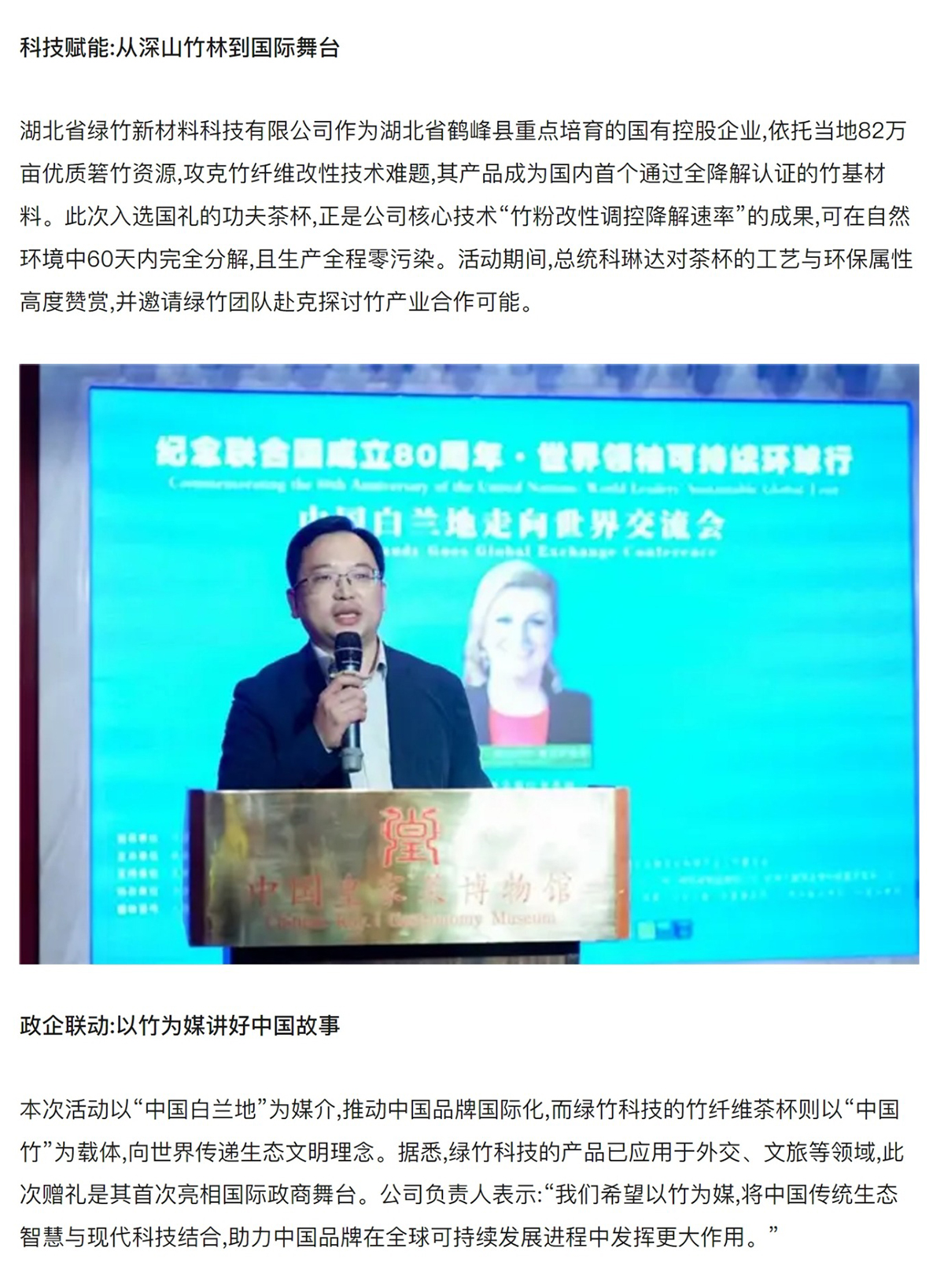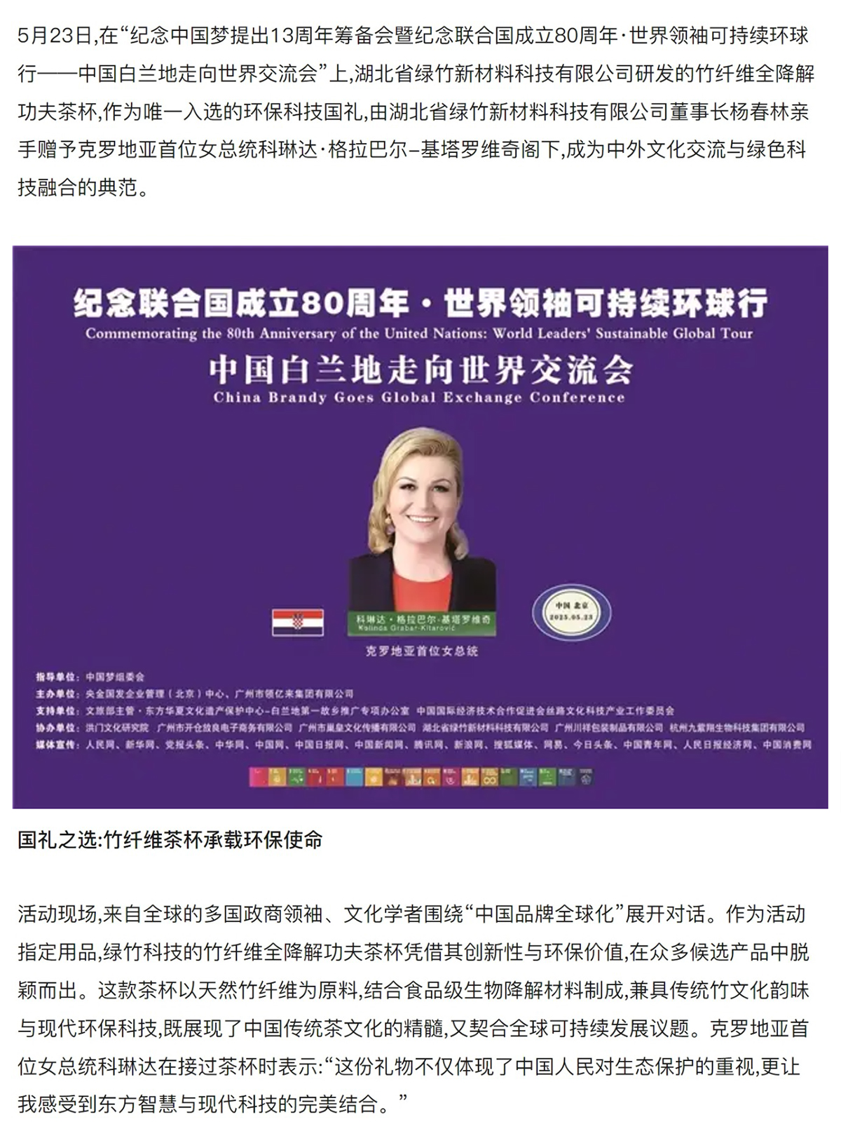 中国竹纤维亮相国际舞台 绿竹茶杯作为国礼赠克罗地亚女总统